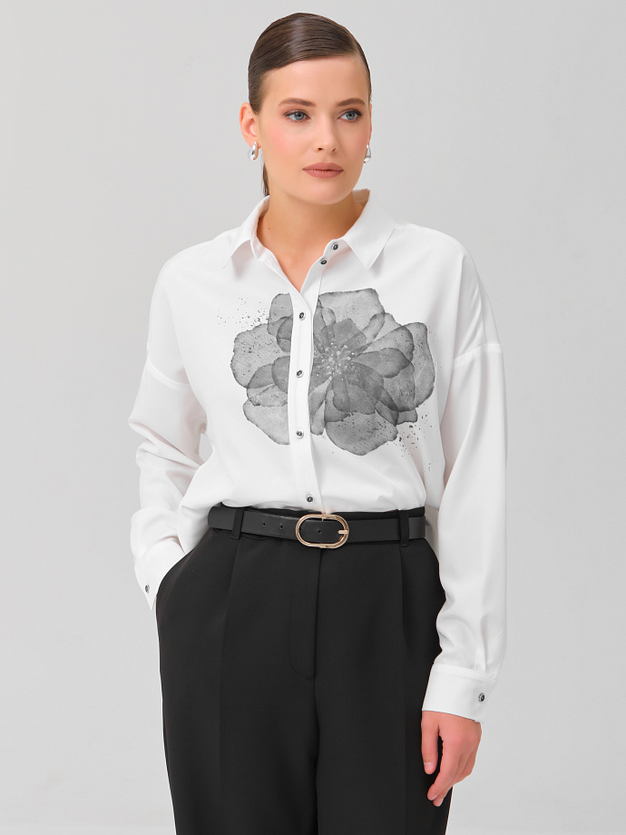 Модель прямого силуэта, со спущеным плечом. Спереди планка с застёжкой на петли и пуговицы. Спинка с кокеткой, под кокеткой скдадка. Воротник сорочечный. По низу рукава разрез, защип и манжета с застёжкой на пуговицу. В боковых швах разрезы. Низ блузки разноуровневый, длиннее по спинке, закруглён.