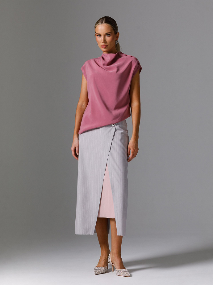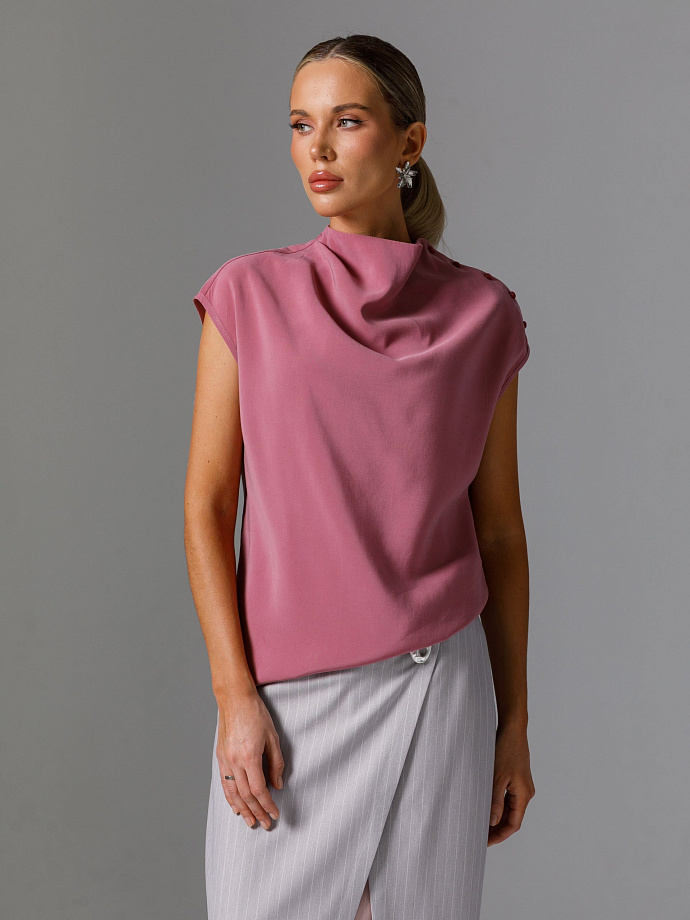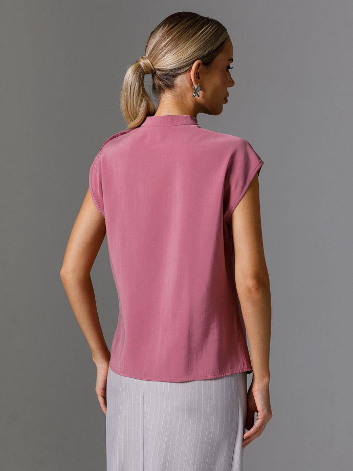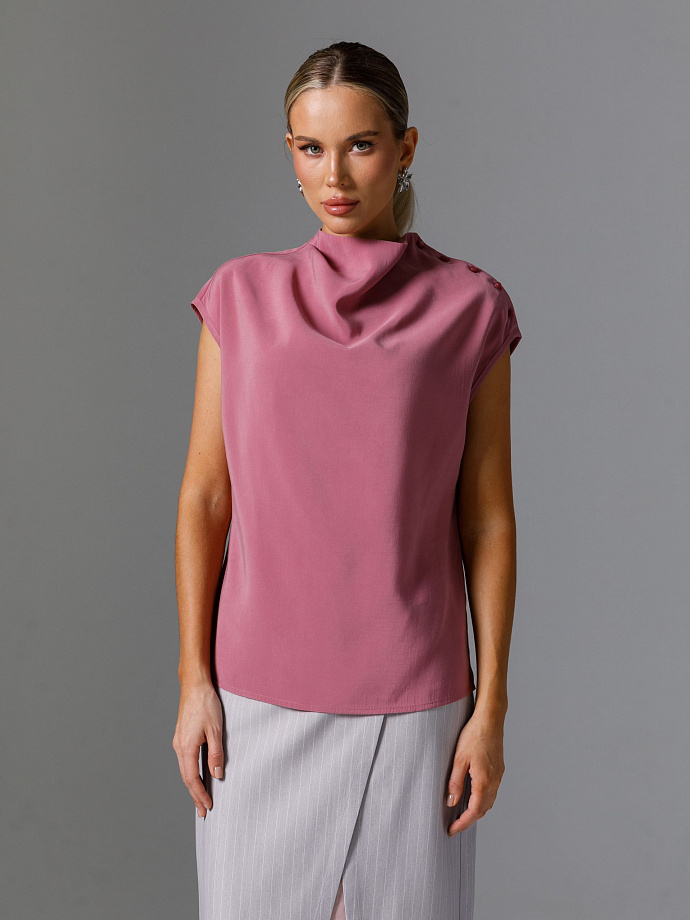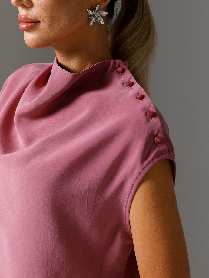 Модель прямого силуэта, без подклада. Воротник комбинированный, спереди качели, сзади стойка. По правому плечевому шву заложена складка, в правом плечевом шве обработана застёжка на петли и пуговицы. Пройма окантована.