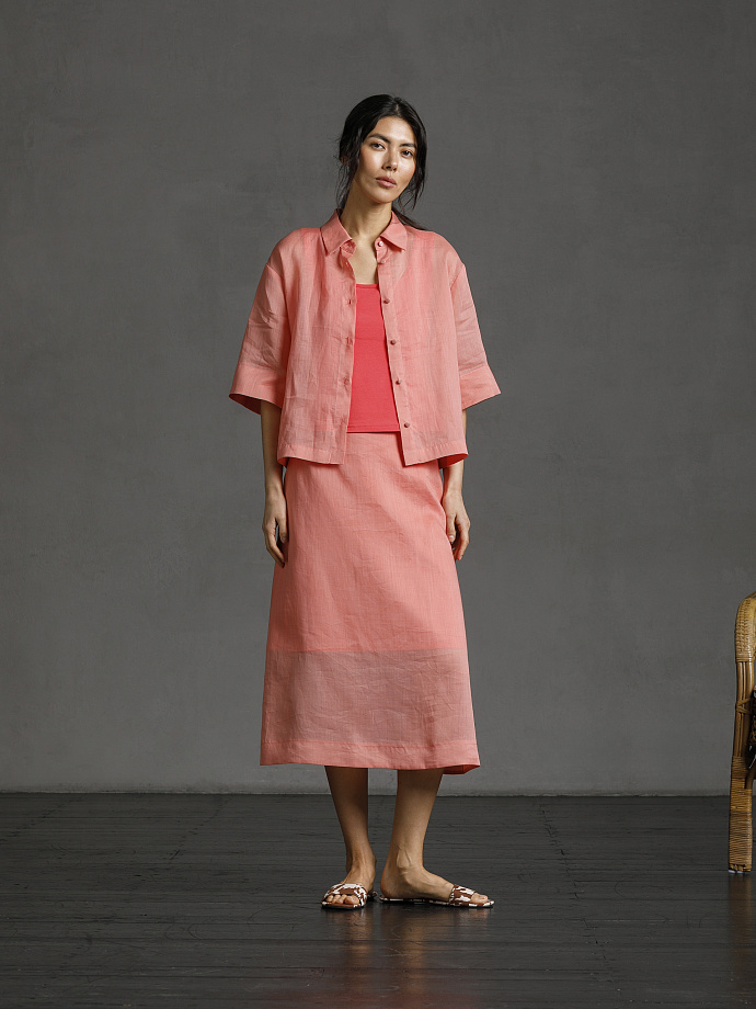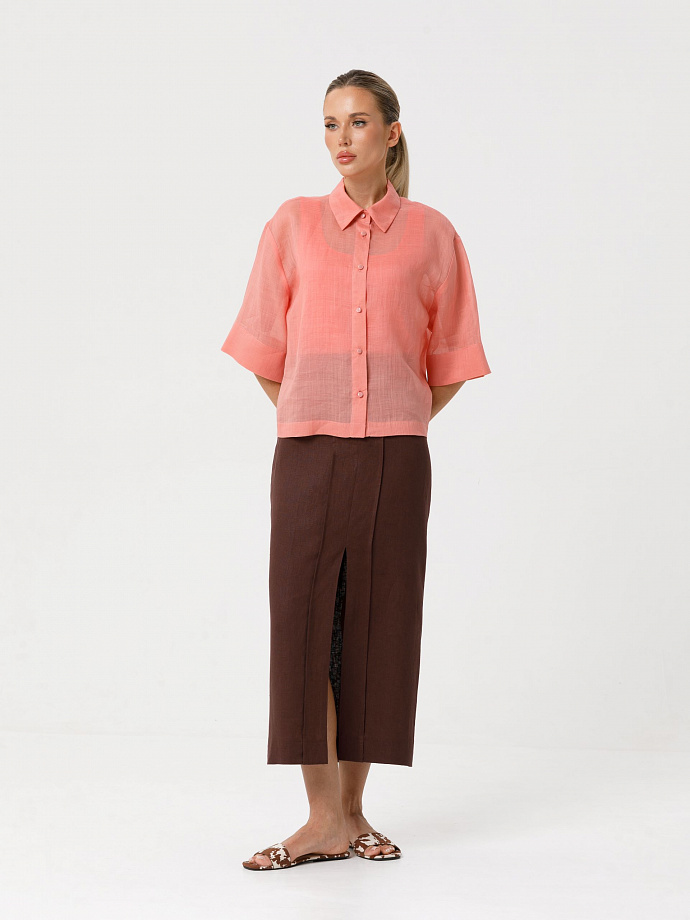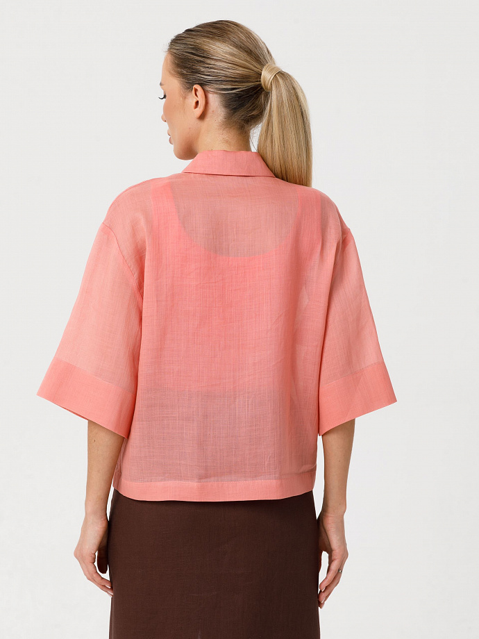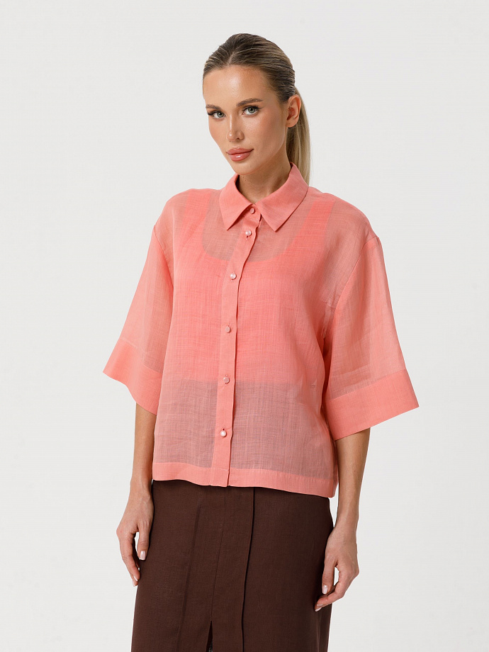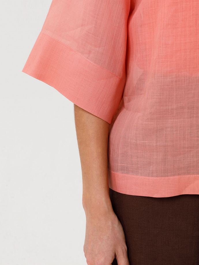 Модель прямого силуэта, со спущенным плечом и рукавом длиной 1/2. Спереди центральная застёжка на петли ипуговицы. Воротник сорочечный.