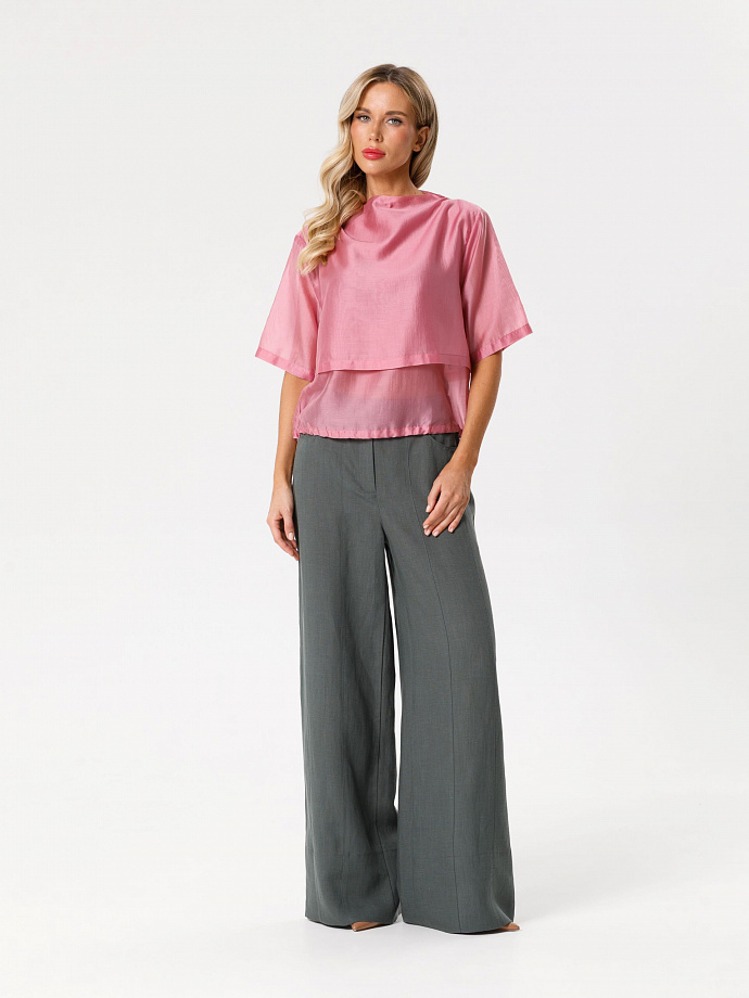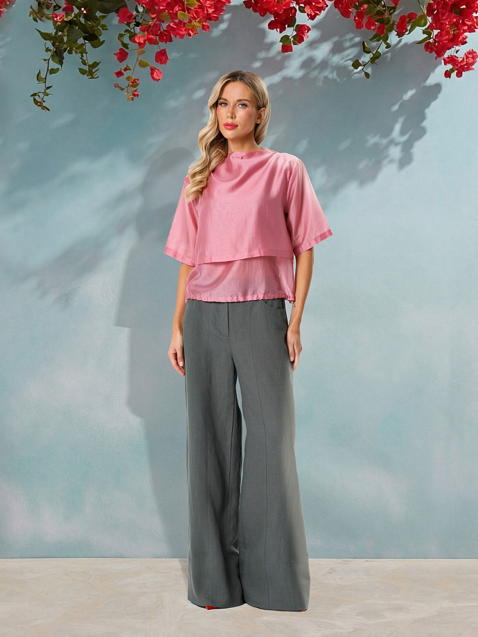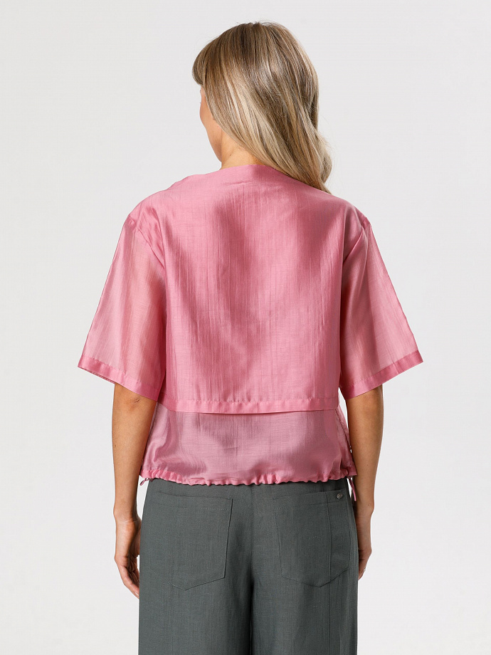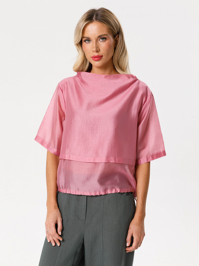 Модель прямого силуэта, со спущенным плечом, коротким рукавом и цельнокроеным воротником стойкой. Перед и спинка двухслойные, верхний слой укороченый. По низу блузки обработана кулиса, в которую вставлен резиновый шнурок с фиксаторами.
