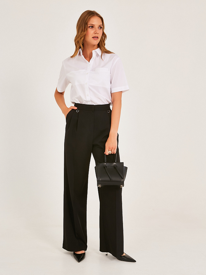 Спереди защипы, карманы в подрезных бочках и декоративные кольца на репсовой ленте. Сзади имитация прорезного кармана с листочкой. На поясе застрочены горизонтальные складки.