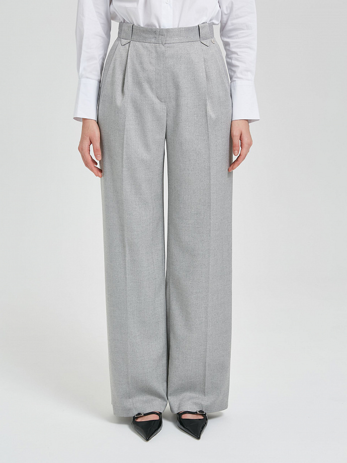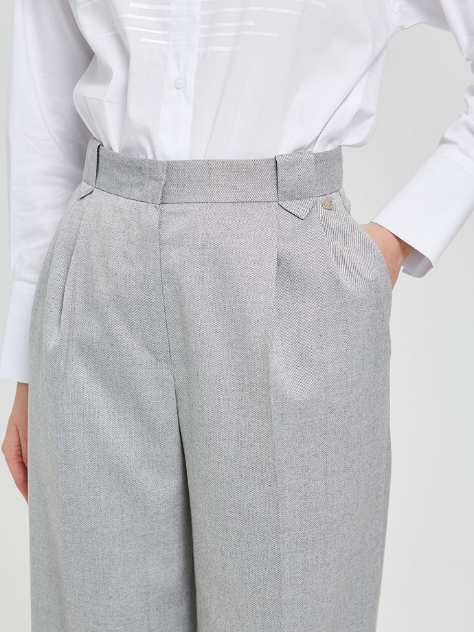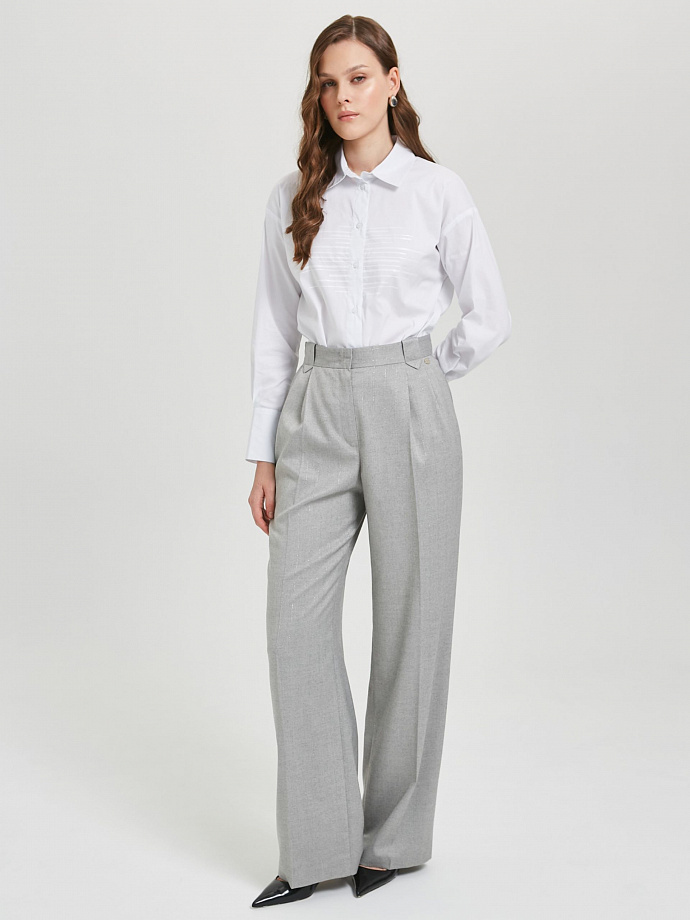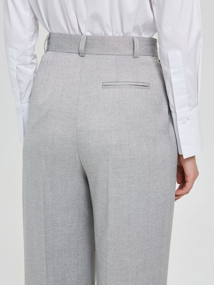 Спереди защипы, карманы в подрезных бочках и фигурные шлёвки на поясе. Сзади прорезной карман в рамку. Ремень в комплект не входит.