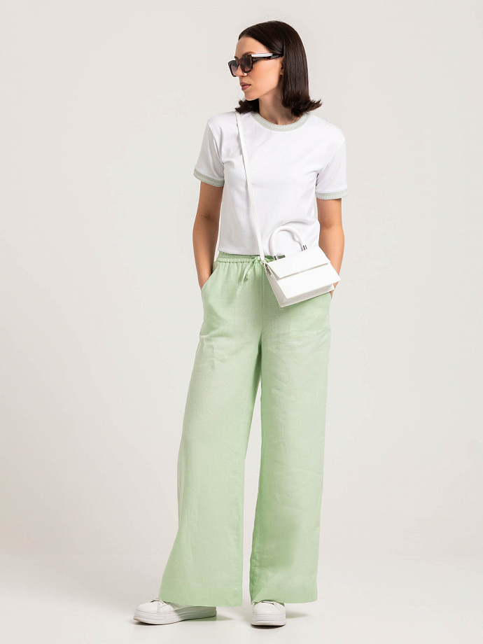 Спереди карманы в подрезных бочках. Сзади фигурные накладные карманы. Пояс эластичный, с кулисой, в которую вставлены завязки. По низу брюк широкая подгибка.