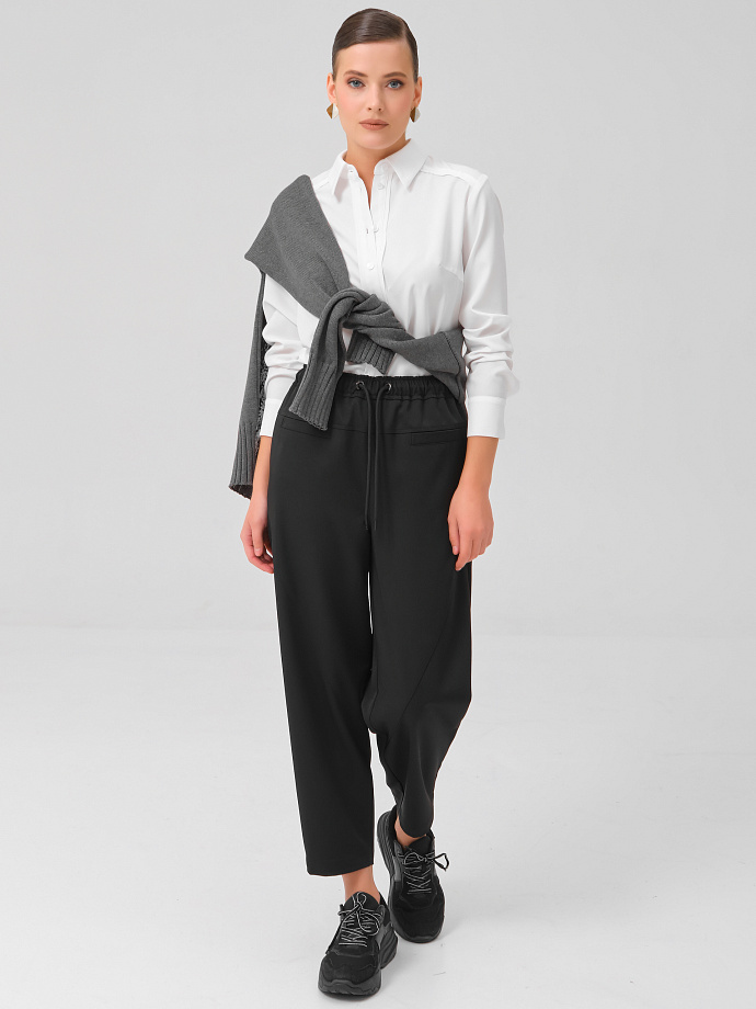 Модель зауженная к низу. Пояс притачной, с резиной и кулисой. В кулису на поясе через люверсы вставлен шнурок с наконечниками. Спереди кокетки и наклонные подрезы. Под кокетками прорезные карманы с листочой. Сзади под кокетками фигурные накладные карманы с клапаном. Брюки декорированы отделочными строчками.