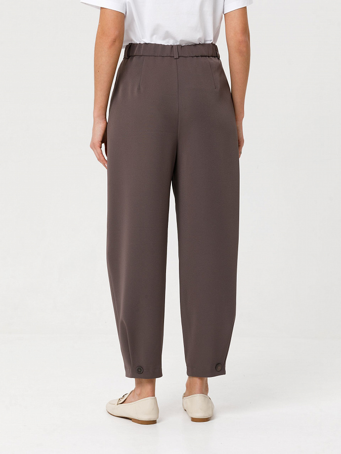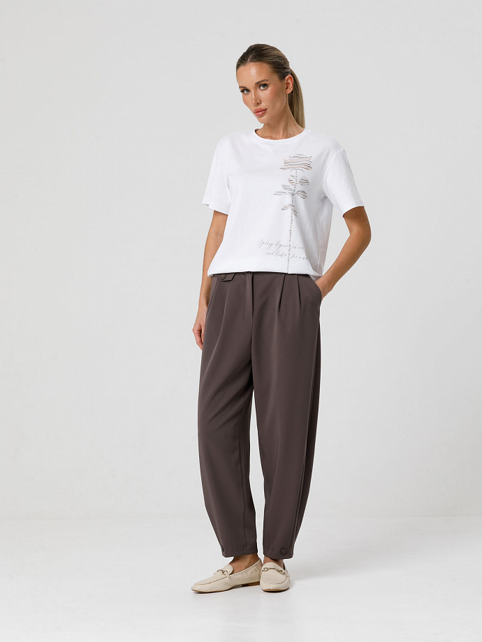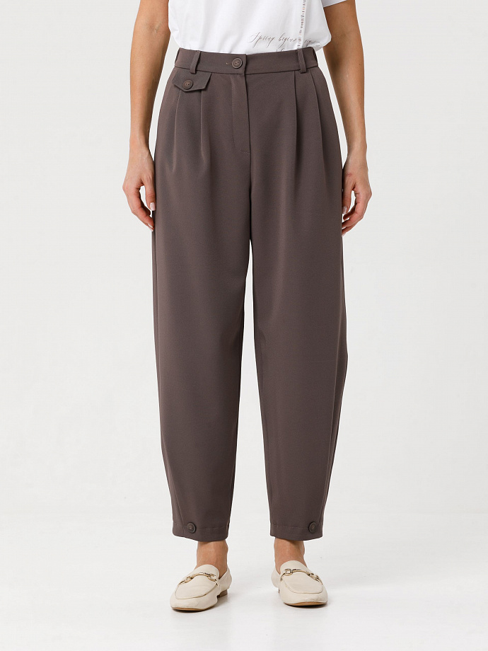 Модель зауженная к низу, на притачном поясе, со шлёвками. Сзади пояс собран на резину. Спереди по талии защипы и декоративный клапан с пуговицей. Застёжка на молнию и пуговицу на поясе. В подрезных бочках карманы. По низу брюк застроченные защипы и декоративные пуговицы. Ремень в комплект не входит.