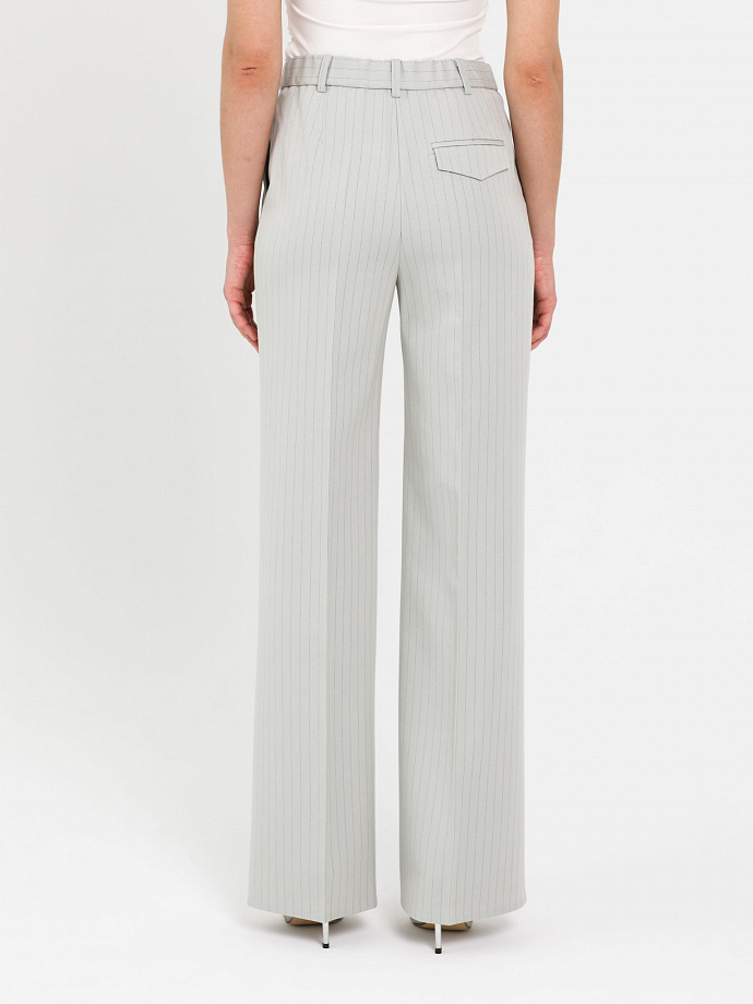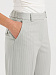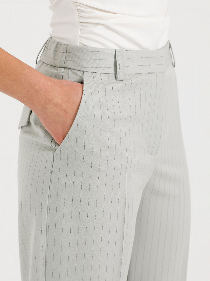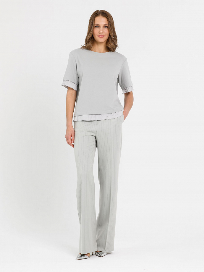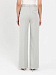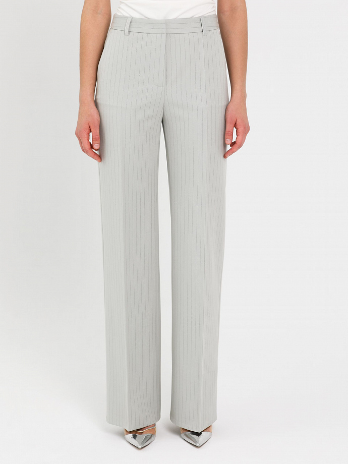 Модель прямого силуэта, на подкройном поясе, со шлёвками. Пояс частично собран на резину. Застёжка на молнию, потайную пуговицу и крючки на поясе. Спереди карманы в подрезных бочках. Сзади прорезной карман в рамку с клапаном. Ремень в комплект не входит.
