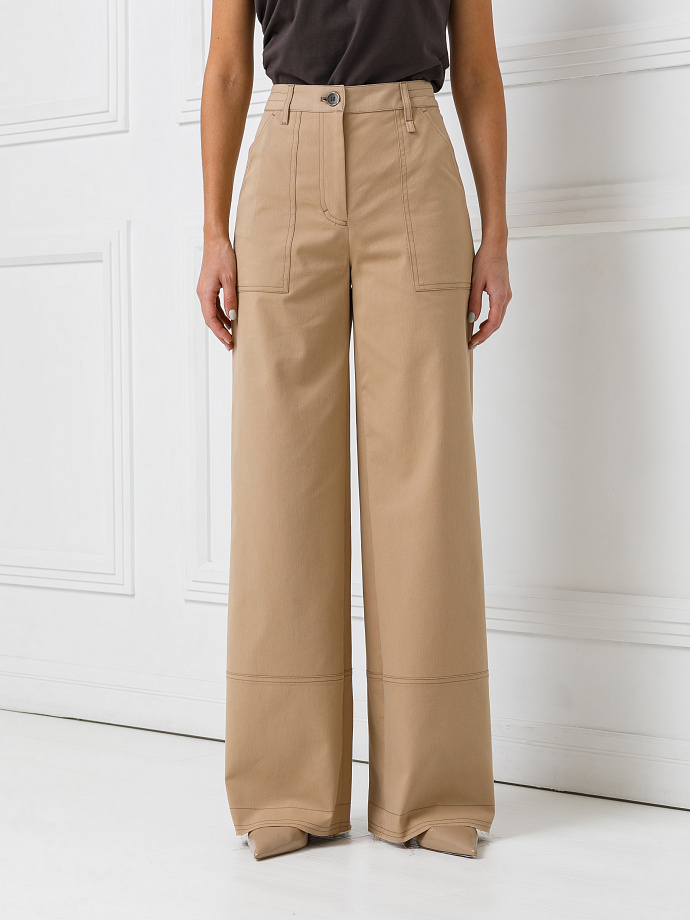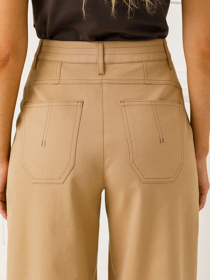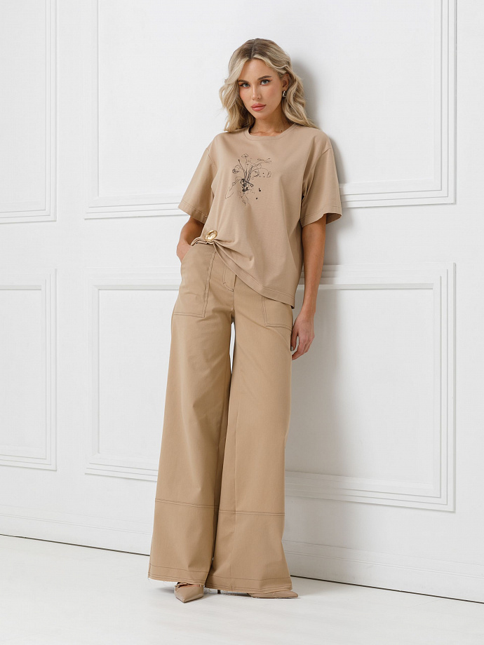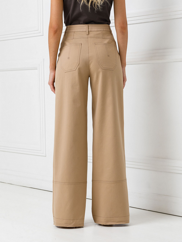 Модель на подкройном поясе, со шлёвками. Спереди накладные карманы и застёжка на молнию и пуговицу на поясе. Сзади кокетки и фигурные накладные карманы. По низу брюк горизонтальные подрезы. Модель декорирована швами с открытыми срезами и отделочными строчками.