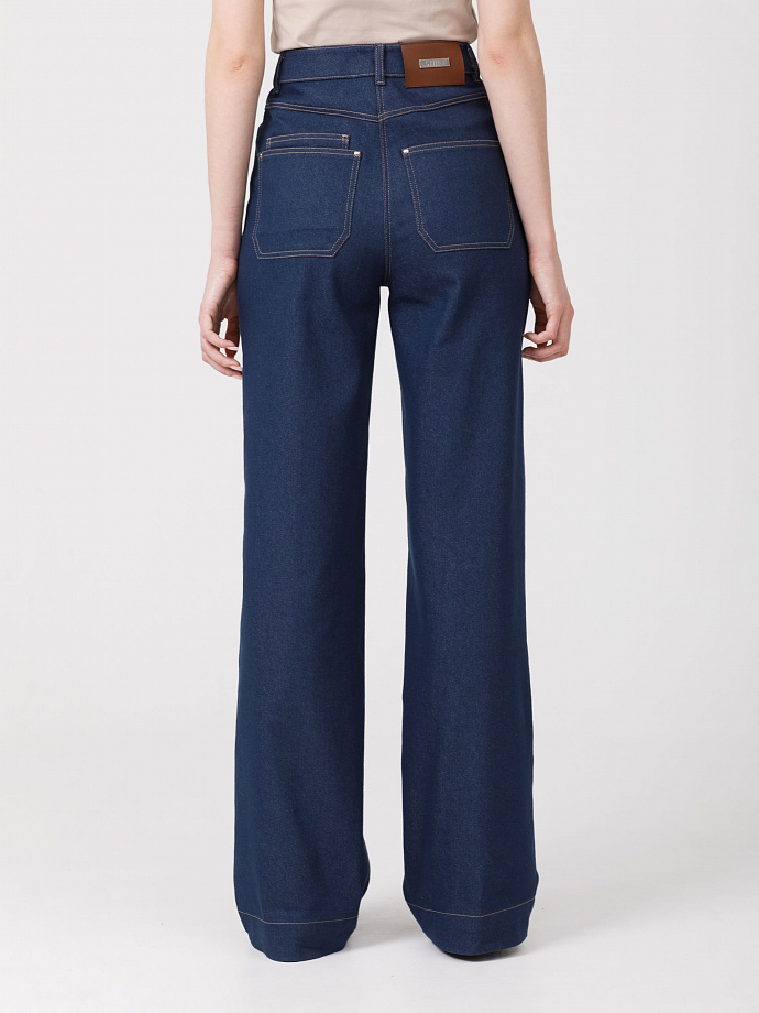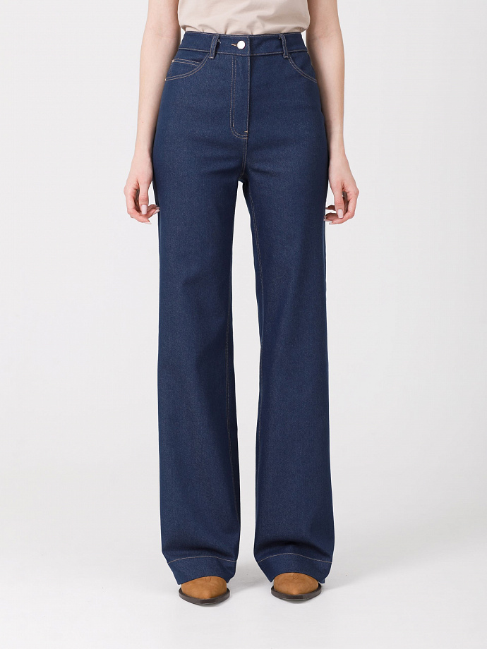 Модель прямого силуэта. Пояс подкройной, со шлёвками. Застёжка на молнию и пуговицу на поясе. Спереди карманы в подрезных бочках. Сзади кокетки и фигурные накладные карманы. Брюки декорированы хольнитенами и отделочными строчками.Ремень в комплект не входит.