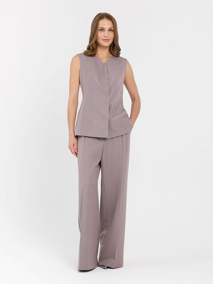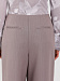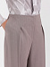 Модель прямого силуэта, низкой посадки, без пояса. Спереди по талии застрочены защипы, в подрезных бочках карманы. Застёжка на крючок и потайную пуговицу. Сзади прорезные карманы в рамку. По низу брюк в швы всталяются съёмные завязки.