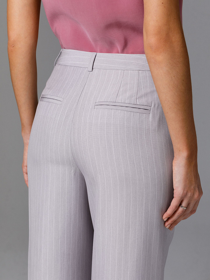 Модель прямого силуэта, на подкройном поясе, со шлёвками. Застёжка на молнию, потайную пуговицу и крючки на поясе. Спереди карманы в подрезных бочках и вертикальные подрезы, обработанные швами с открытыми срезами. Сзади прорезные карманы в рамку. Ремень в комплект не входит.