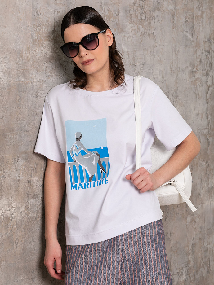 Модель прямого силуэта, со спущенным плечом. Горловина обработана бейкой.