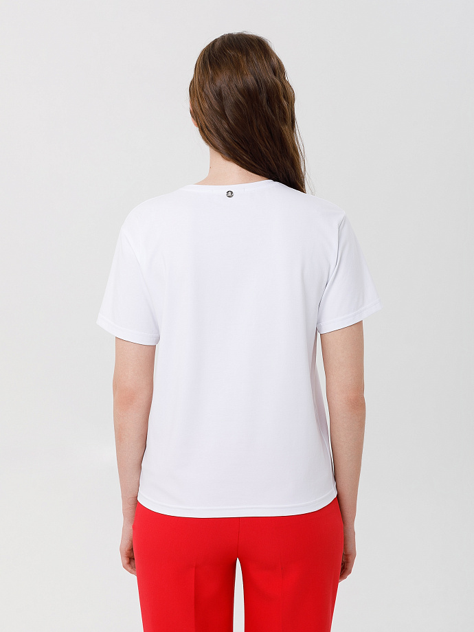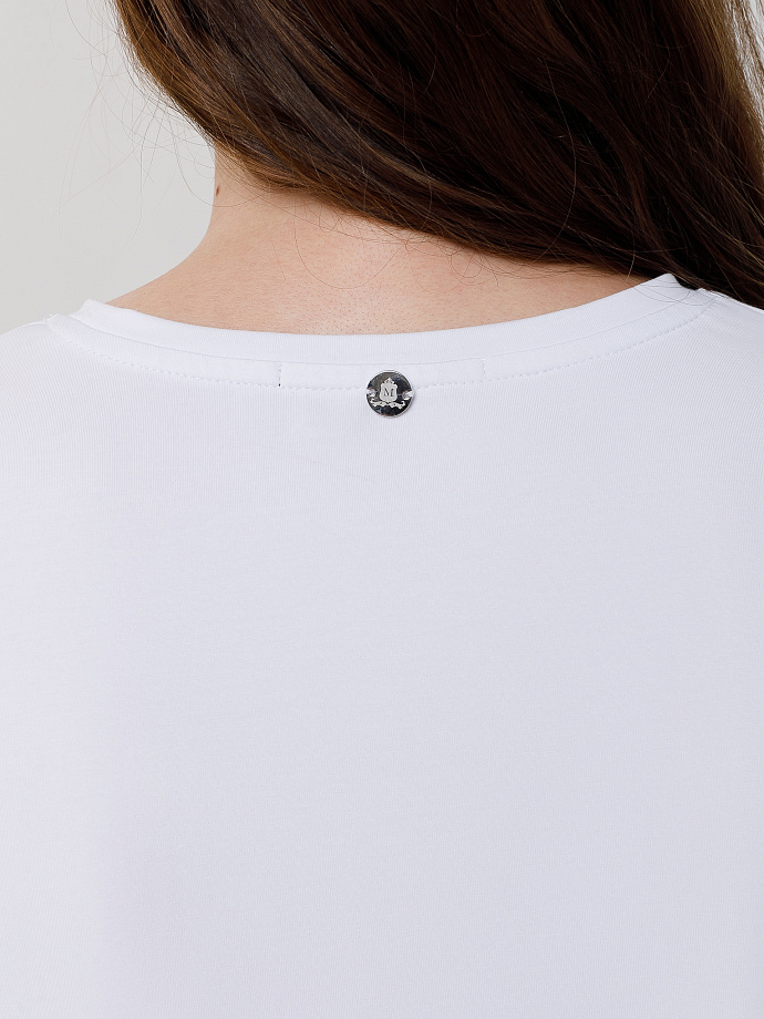 Модель прямого силуэта, со спущенным плечом. Горловина обработана бейкой.