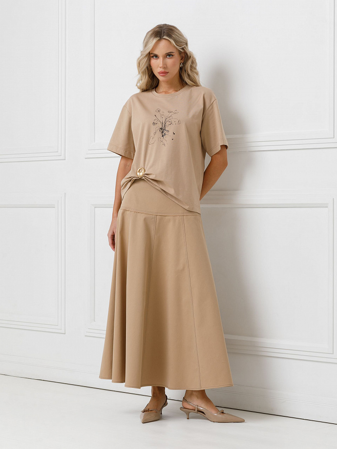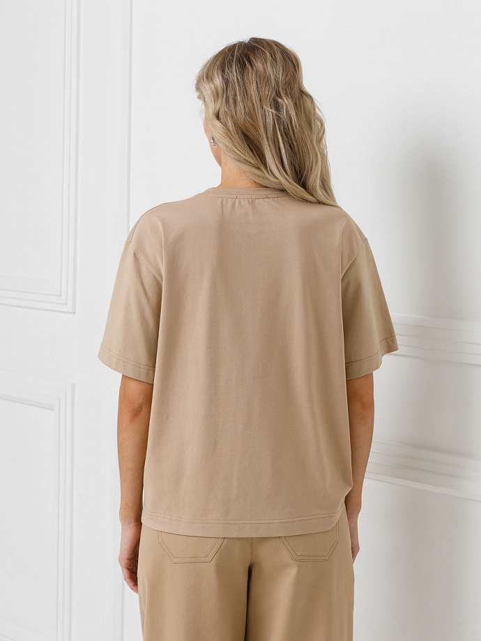 Модель прямого силуэта, со спущенным плечом. Горловина обработана бейкой. По низу футболки ассиметричные складки и декоративная брошь.