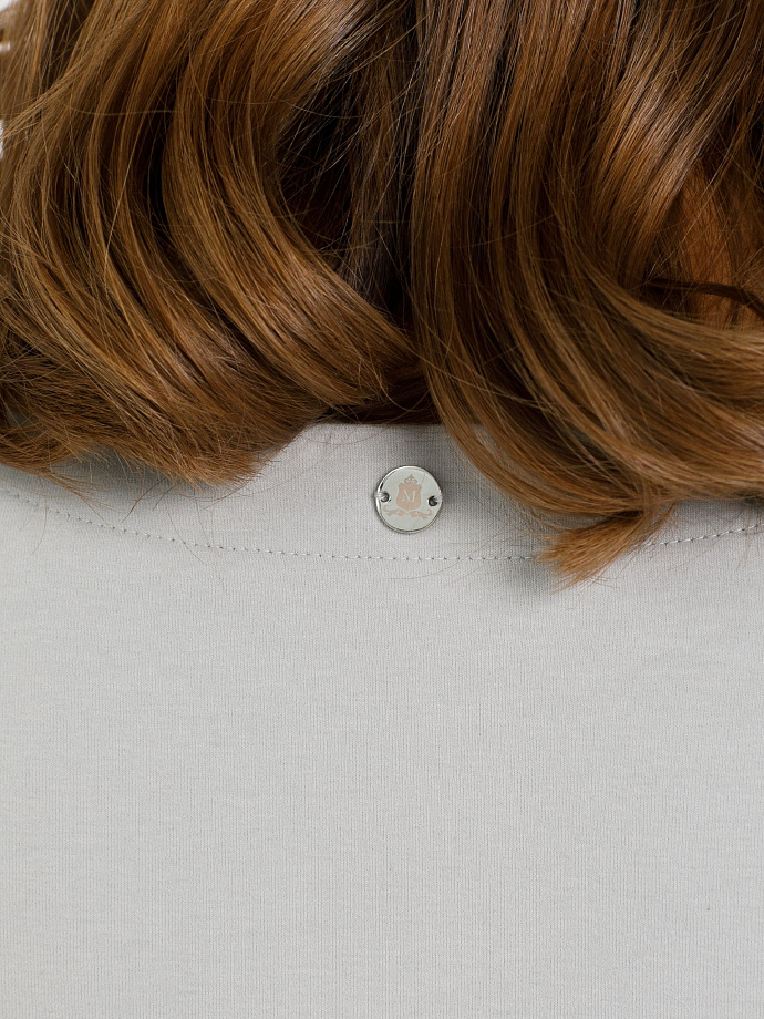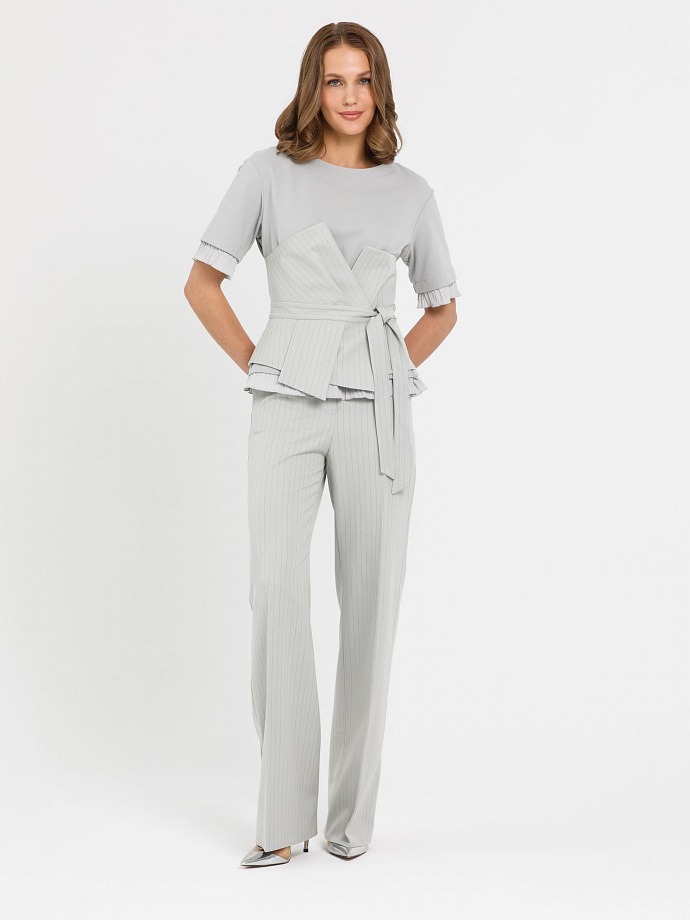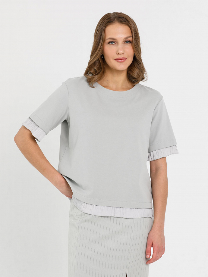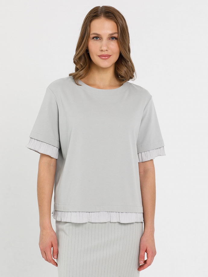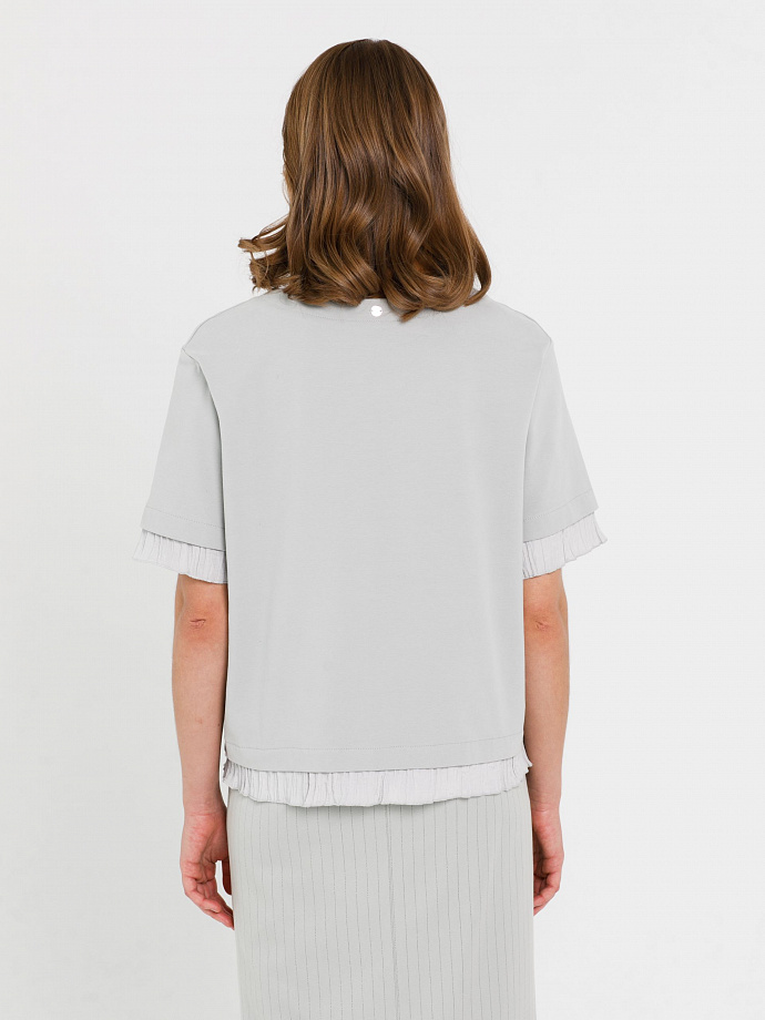 Модель прямого силуэта, со спущенным плечом. По низу рукава и низу изделия отделка из жатой ткани.