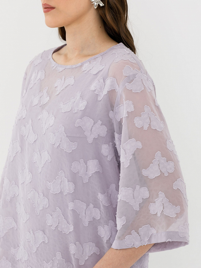 Топ из атласа, полуприлегающего силуэта, с V-образным вырезом горловины. Пройма окантована. Блузка из шифона с вытравкой, прямого силуэта, со спущенным плечом и рукавом 3/4. Округлый вырез горловины. окантован.