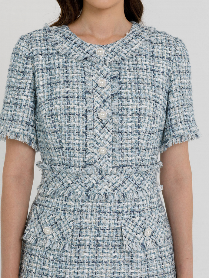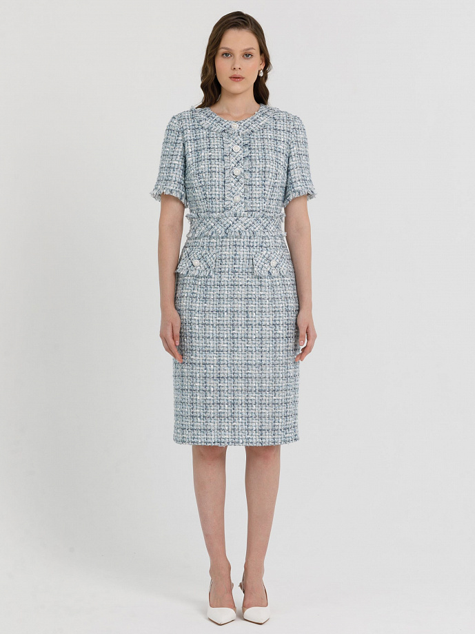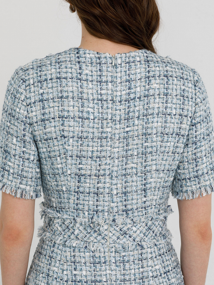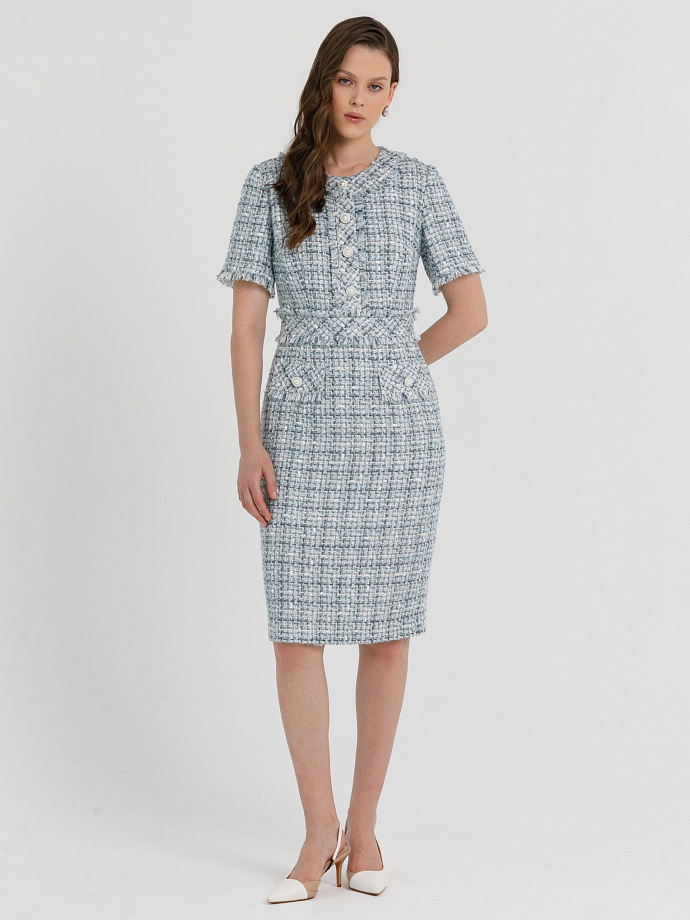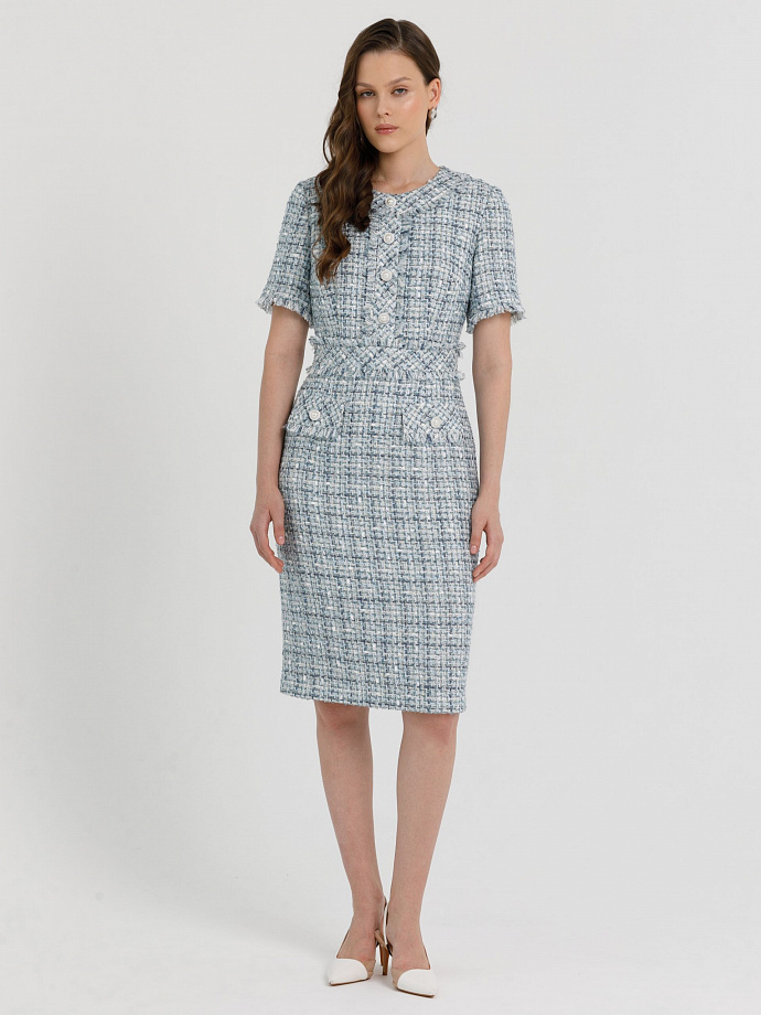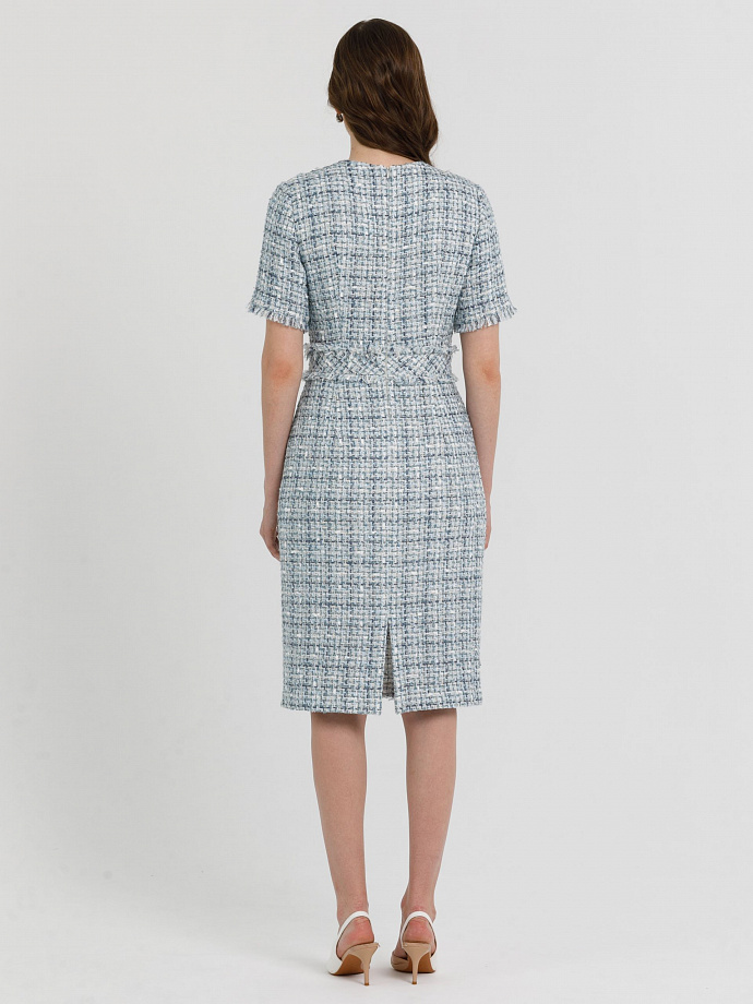 Модель полуприлегающего силуэта, с отрезной линией талии и втачным поясом. На верхней части переда настрочена планка, на нижней - клапаны. Округлый вырез горловины спереди подчёркнут планкой. Средний шов спинки снизу заканчивается разрезом. Платье декорировано пуговицами.