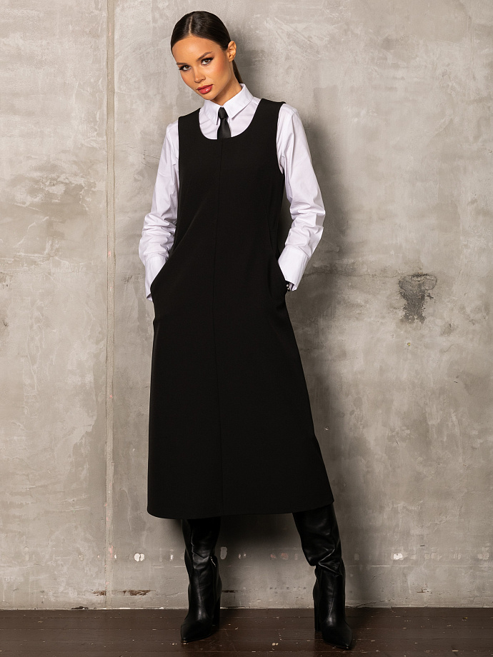 Сарафан полуприлегающего силуэта, расширенный к низу.