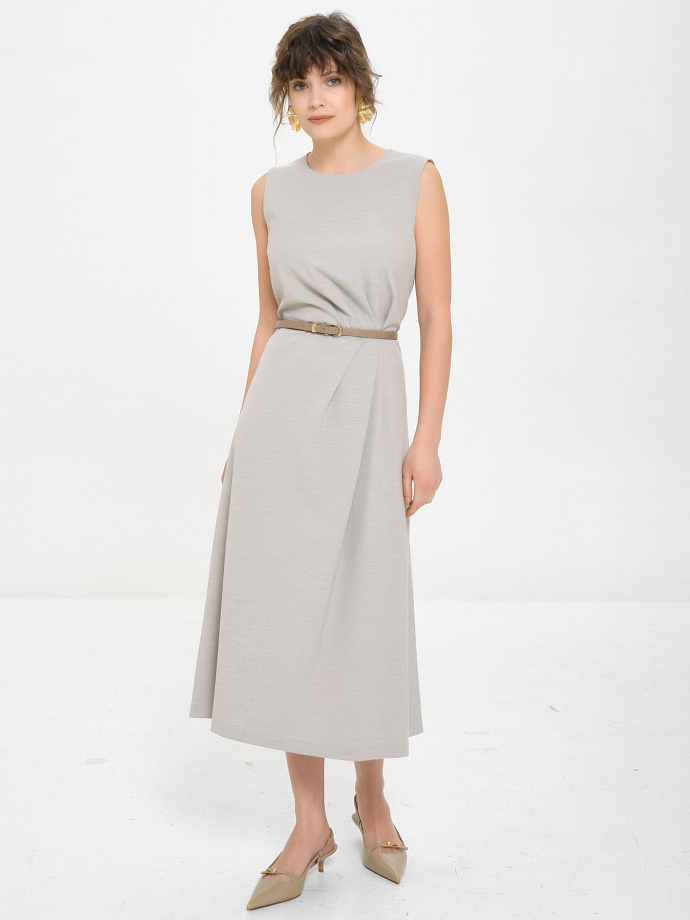 Модель Х-образного силуэта, с отрезной линией талии, без подклада. В среднем шве спинки потайная застёжка молния. Спереди по талии обработана ассиметричная группа защипов.