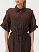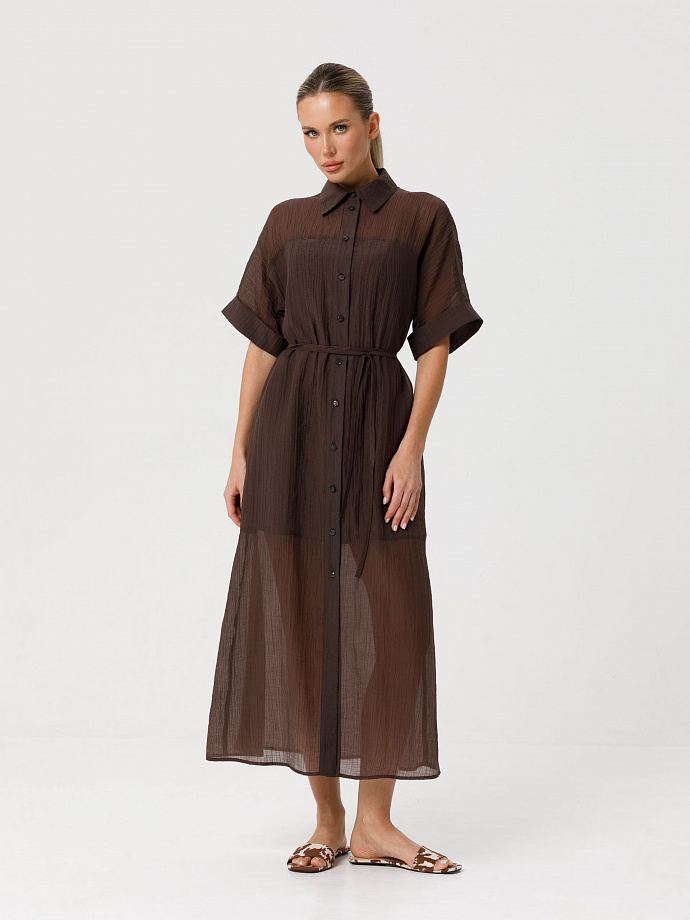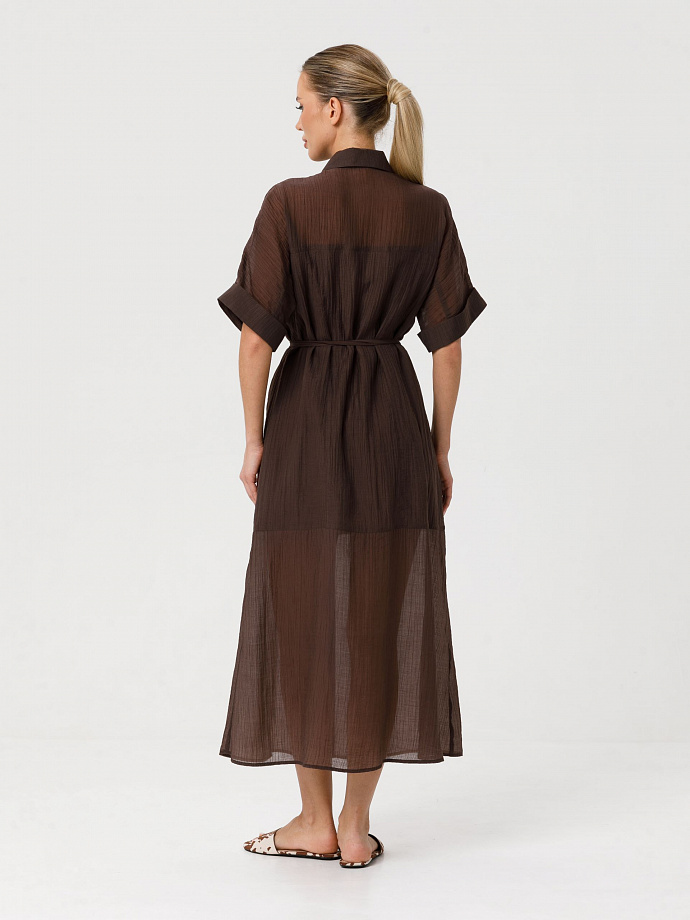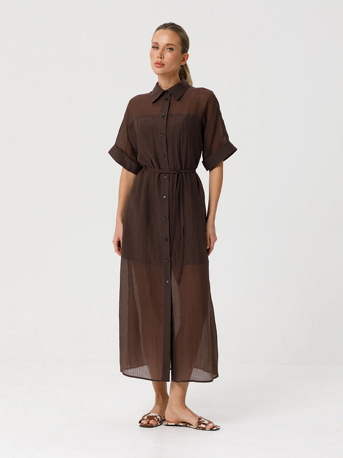 Модель полуприлегающего силуэта, с коротким цельнокроеным рукавом, на частичном подкладе из хлопка. Перед и спинка с кокетками, горизонтальным подрезом и рельефами. Спереди планка с застёжкой на петли и пуговицы. Воротник сорочечный. По низу рукава манжета с отворотом. Талия подчёркнута поясом шнурком.