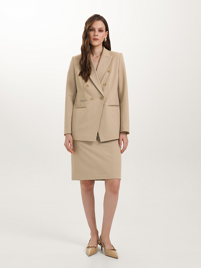 Модель прямого силуэта, без пояса, на подкладе. Спереди прорезные карманы в рамку. Сзади в среднем шве обработаны шлица и потайная застёжка молния.
