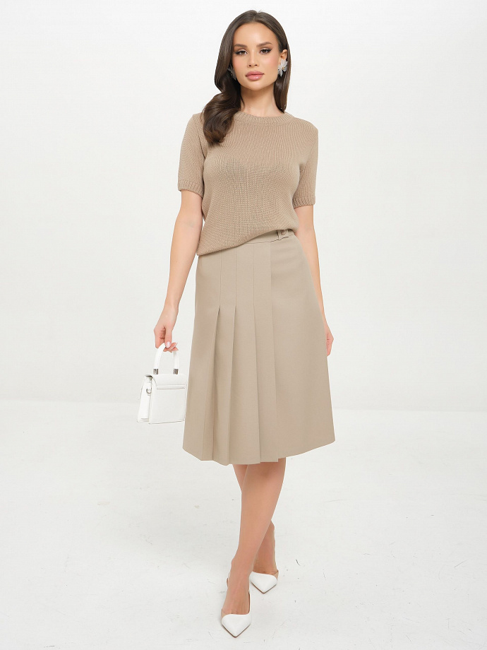 Модель А-образного силуэта, без подклада, на подкройном поясе. На поясе шлёвка и застёжка на петли и пуговицы. Спереди частично застрочены односторонние складки.