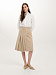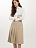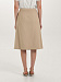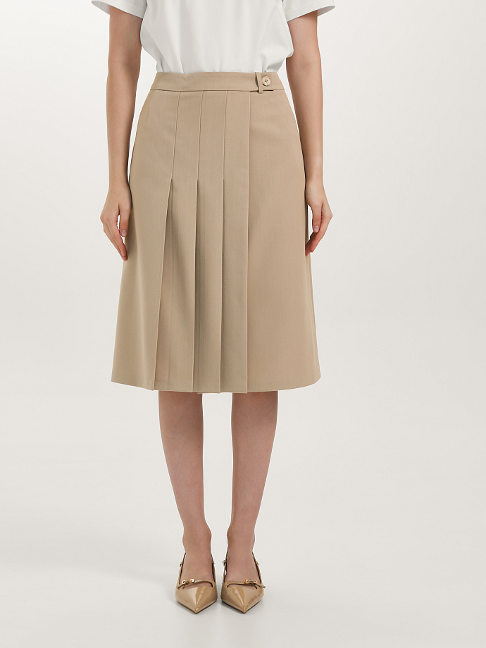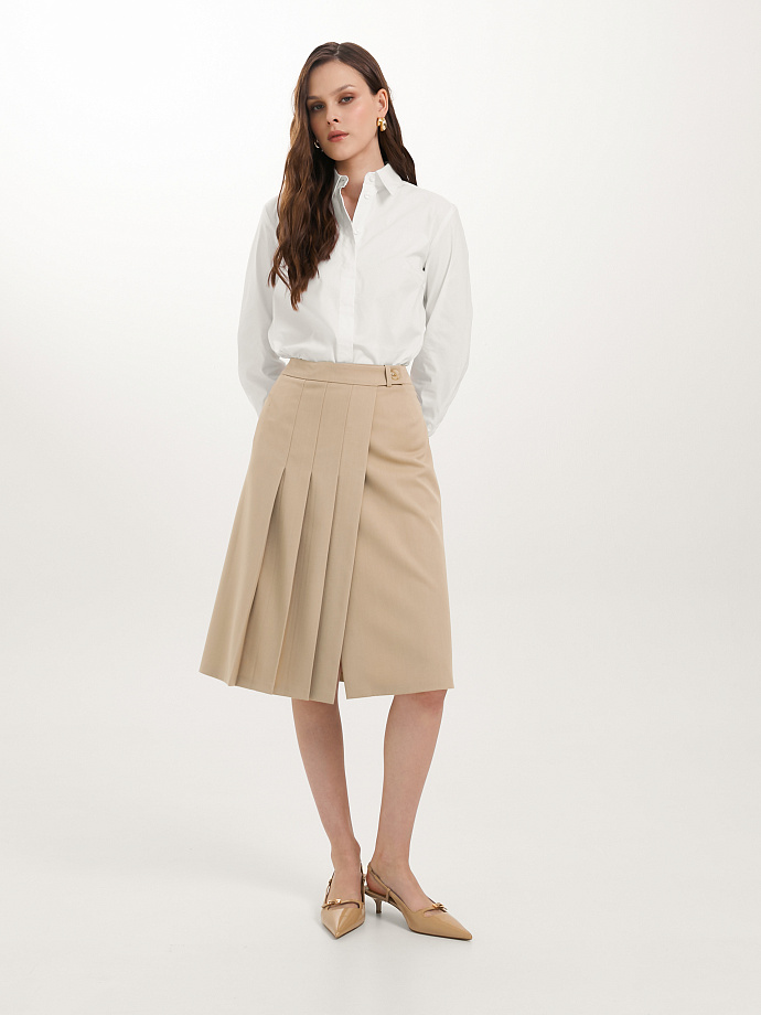 Модель А-образного силуэта, без подклада, на подкройном поясе. На поясе шлёвка и застёжка на петли и пуговицы. Спереди частично застрочены односторонние складки.