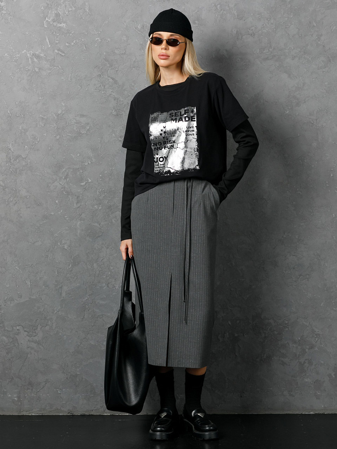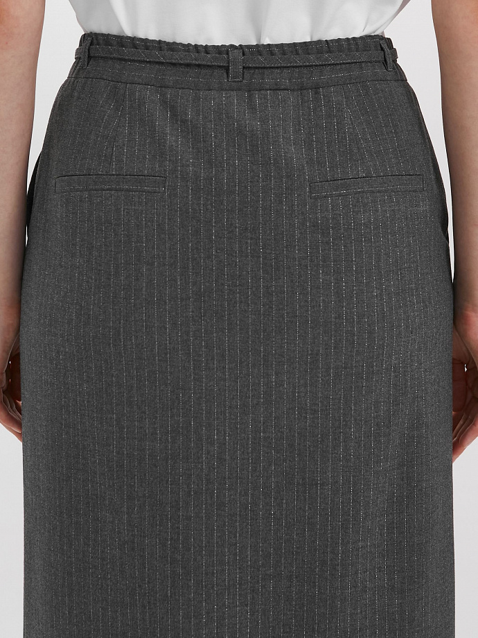 Модель прямого силуэта, на подкладе. Пояс притачной, с резиной и шлёвками. Спереди карманы в подрезных бочках и высокий разрез в среднем шве. Застёжка на молнию и крючки с пуговицей на поясе. Сзади прорезные карманы с листочкой. В шлёвки вставлен пояс-шнурок с наконечниками.