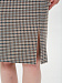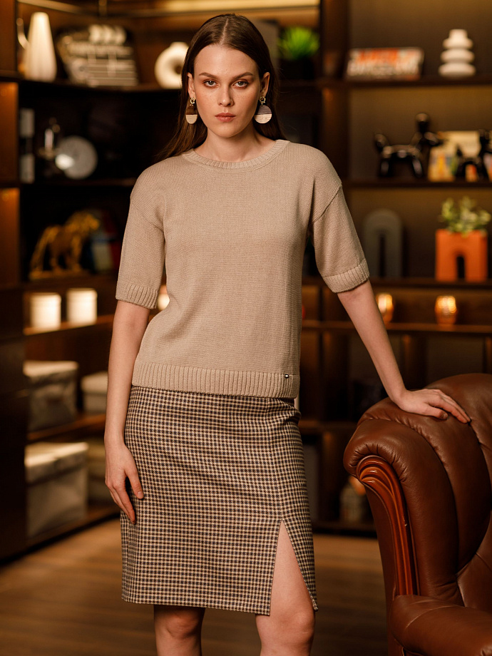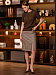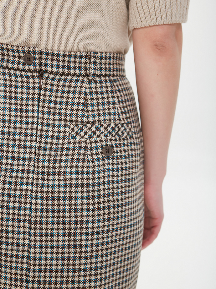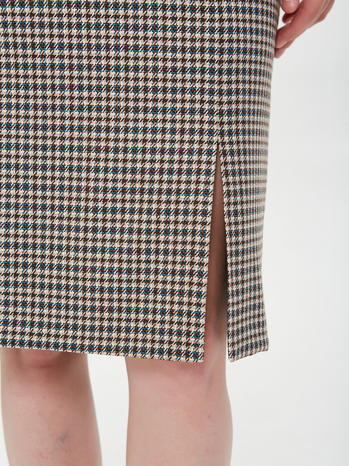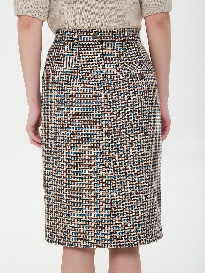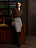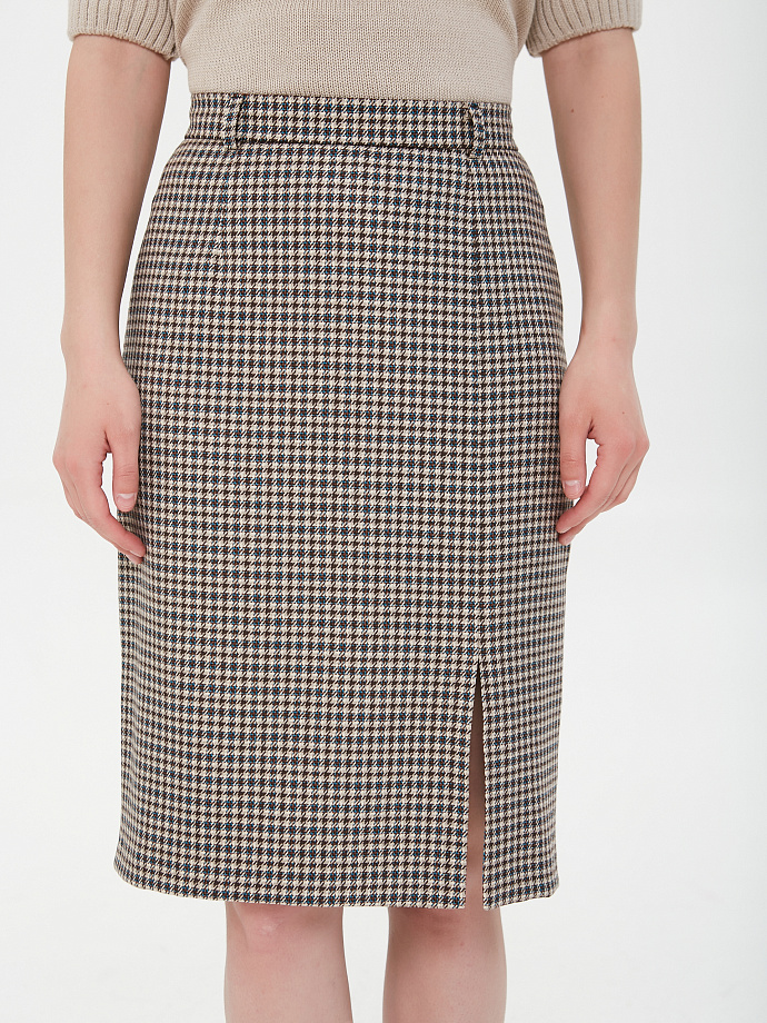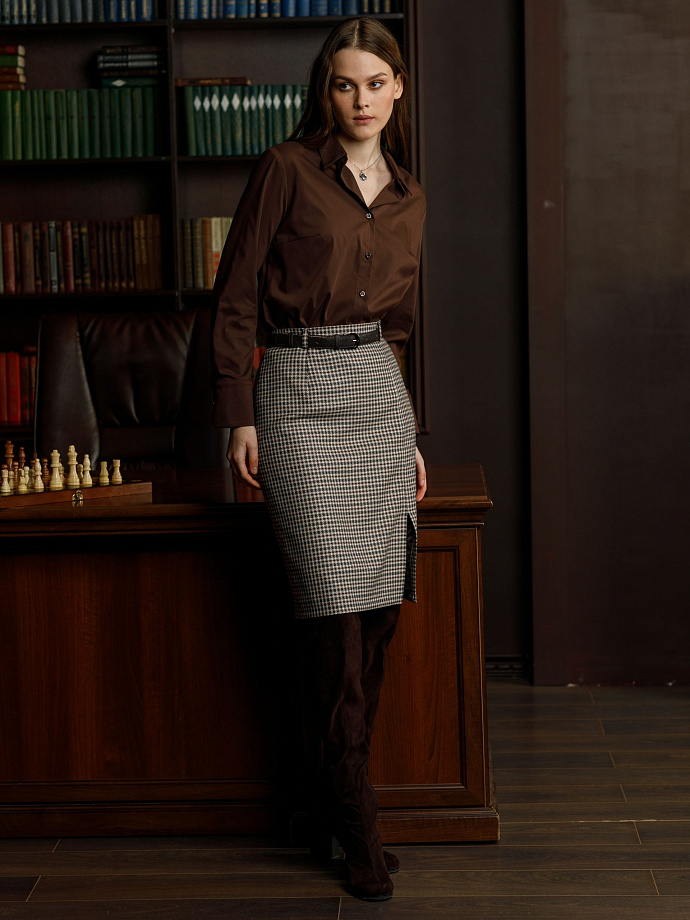Модель прямого силуэта, на подкладе и притачном поясе со шлёвками. Спереди в рельефе высокий разрез. Сзади прорезной карман с листочкой и застёжкой на пуговицу. В среднем шве обработаны шлица и застёжка на потайную молнию и пуговицу на поясе. Ремень в комплект не входит.