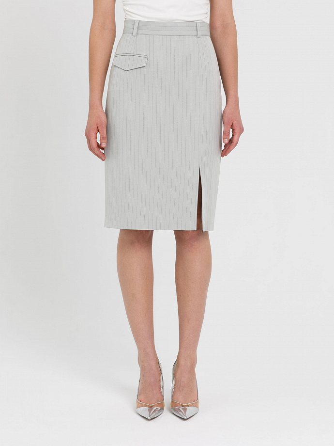 Модель прямого силуэта, слегка зауженная к низу, на подкладе. Перед ассиметричный, рельеф слева заканчивается высоким разрезом. Справа прорезной карман в рамку с клапаном. Сзади в среднем шве обработана потайная застёжка молния. Пояс притачной, со шлёвками. Ремень в комплект не входит.