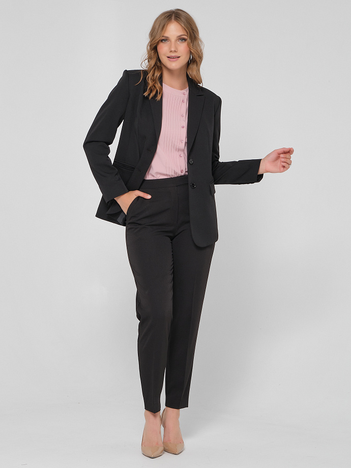 Модель с рельефами. Спинка со средним швом. Спереди прорезные карманы в рамку с клапанами. Край борта закруглён. По низу рукава обработана шлица с декоративными пуговицами.