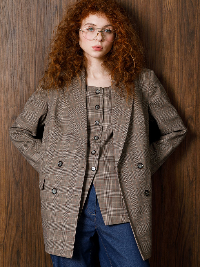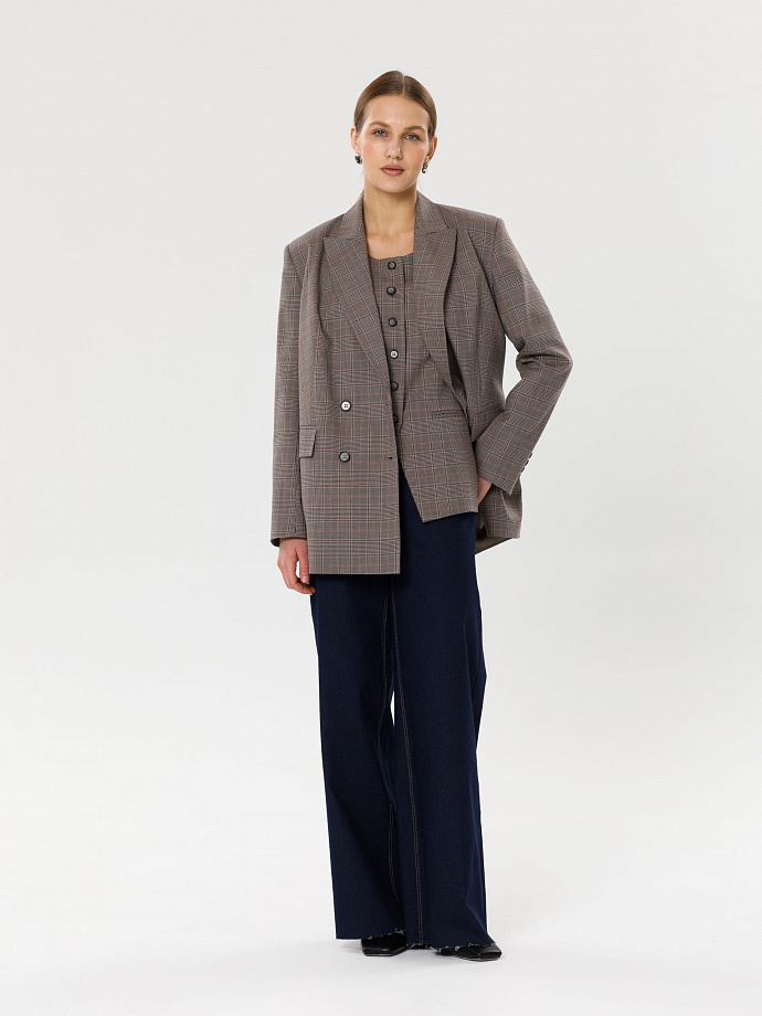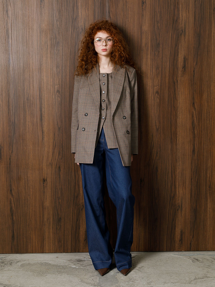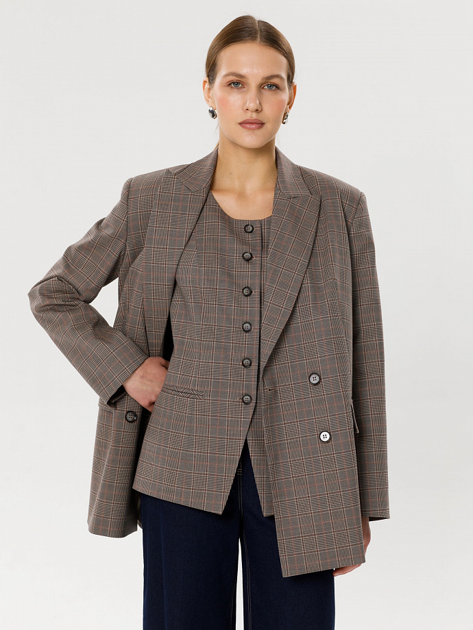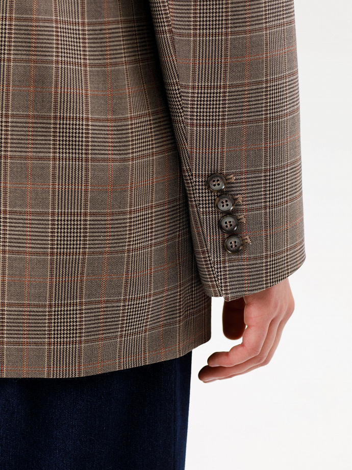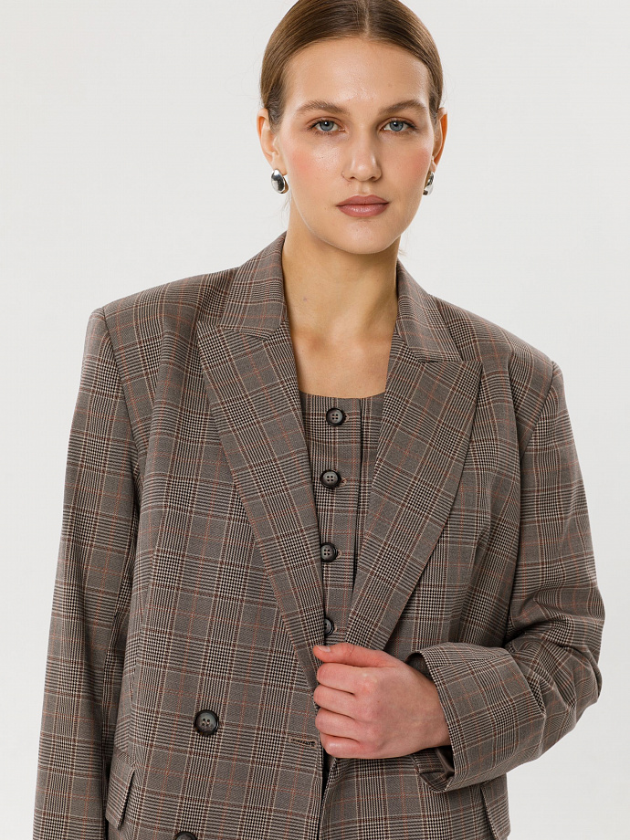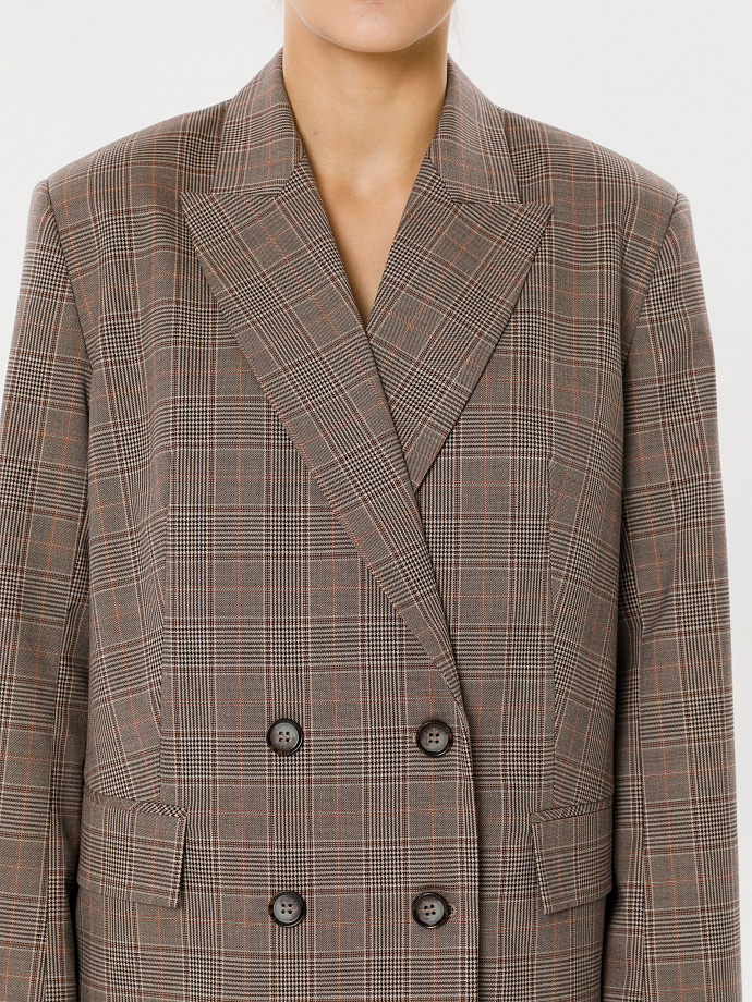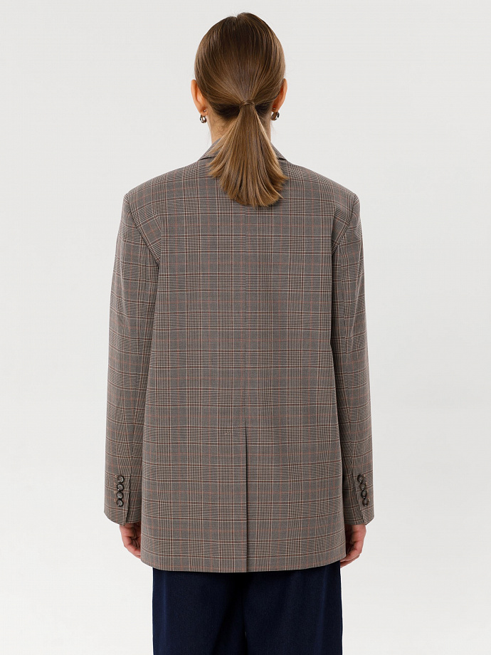 Модель прямого силуэта, на подкладе, с двубортной застёжкой на петли и пуговицы. Спереди прорезные карманы в рамку с клапаном. Средний шов спинки снизу заканчивается шлицей. Воротник английский. По низу рукава отлетная шлица с декоративными петлями и пуговицами.