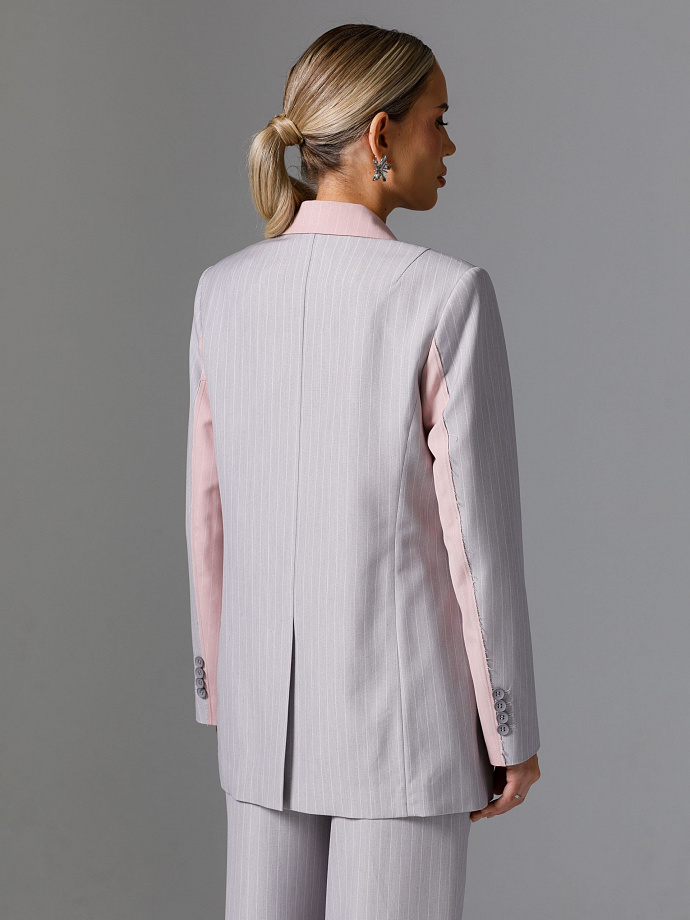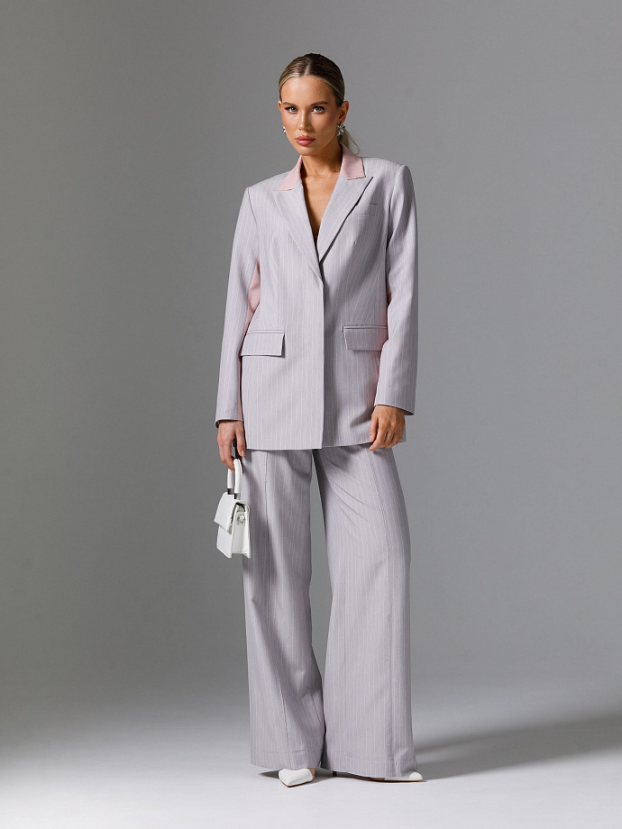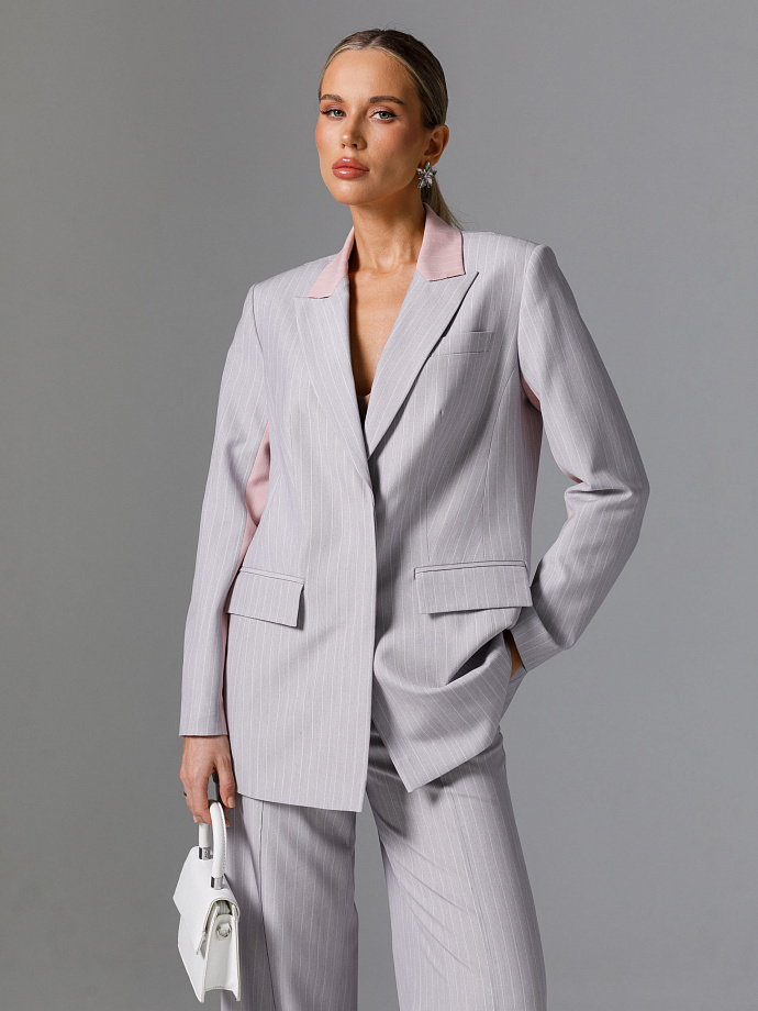 Модель полуприлегающего силуэта, с рельефами, на частичном подкладе.Спереди центральная потайная застёжка на петли и пуговицы, прорезные карманы в рамку с клапаном, а также нагрудный карман с листочкой. Средний шов спинки снизу заканчивается шлицей. Воротник английский. По низу рукава имитация шлицы с отделочными петлями и пуговицами. Жакет декорирован швами с открытыми срезами.
