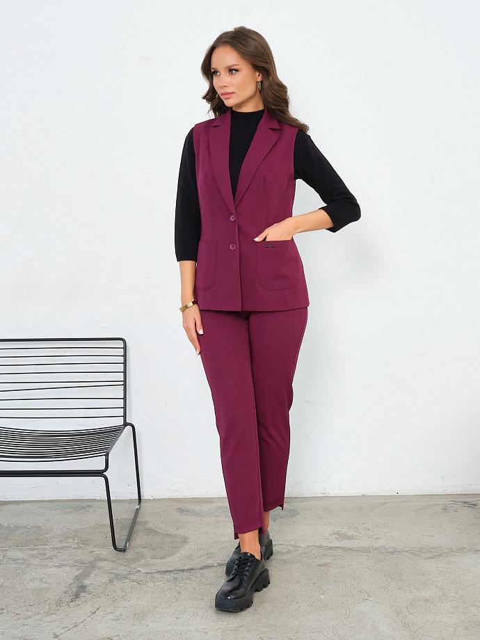Спинка с рельефами и средним швом. Перед с рельефами и округлыми карманами. На левом кармане пришит декоративный элемент.