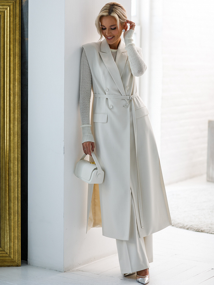 Модель прямого силуэта, с рельефами, без боковых швов, на подкладе, с плечевыми накладками. Застёжка двубортная на петли и пуговицы. Воротник пиджачный. Спереди прорезные карманы в рамку с клапаном и карман с листочкой. Рельефы заканчиваются высокими разрезами. В среднем шве спинки обработана шлица. Талия подчёркнута съёмным поясом из основной ткани с полукольцами и наконечником.